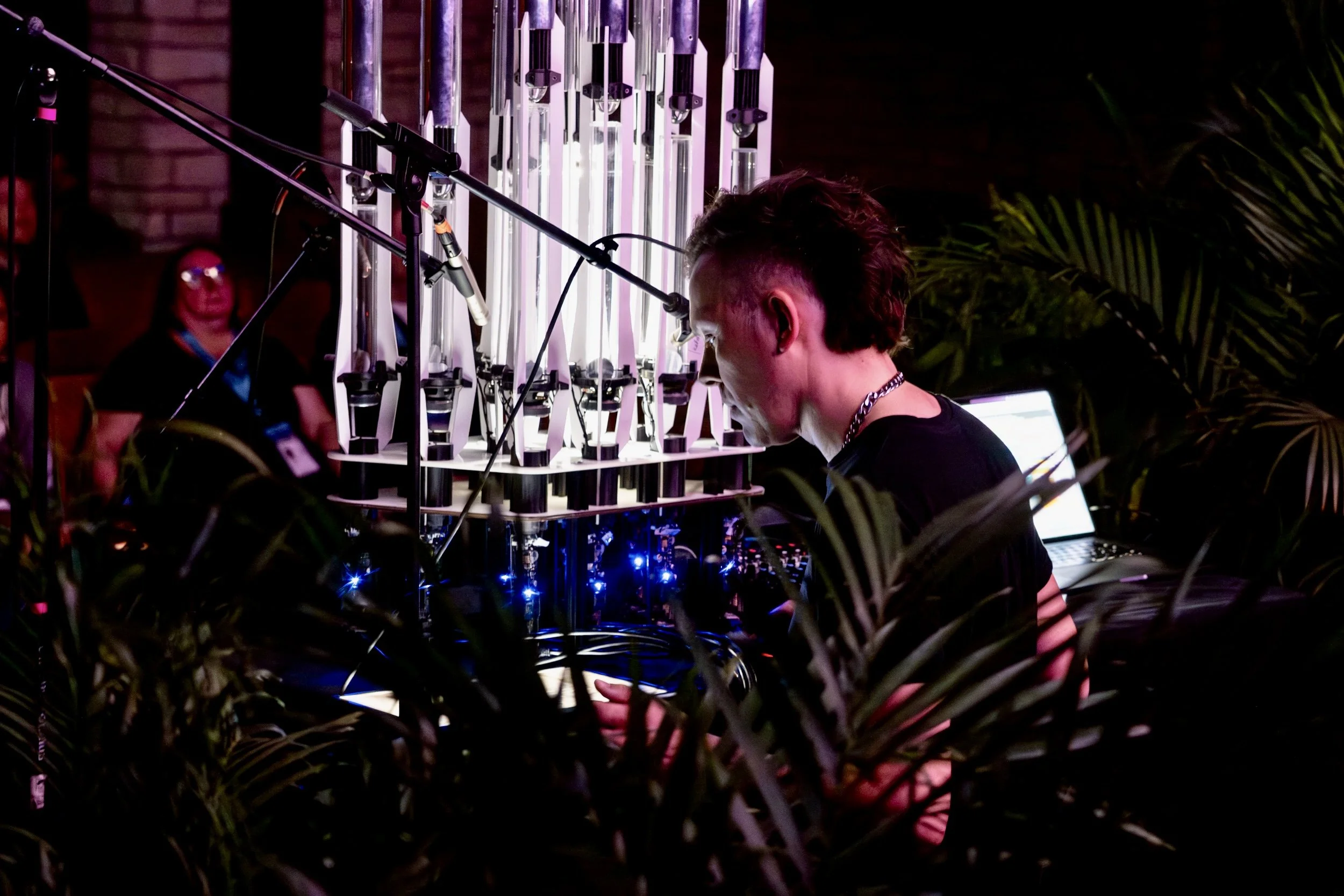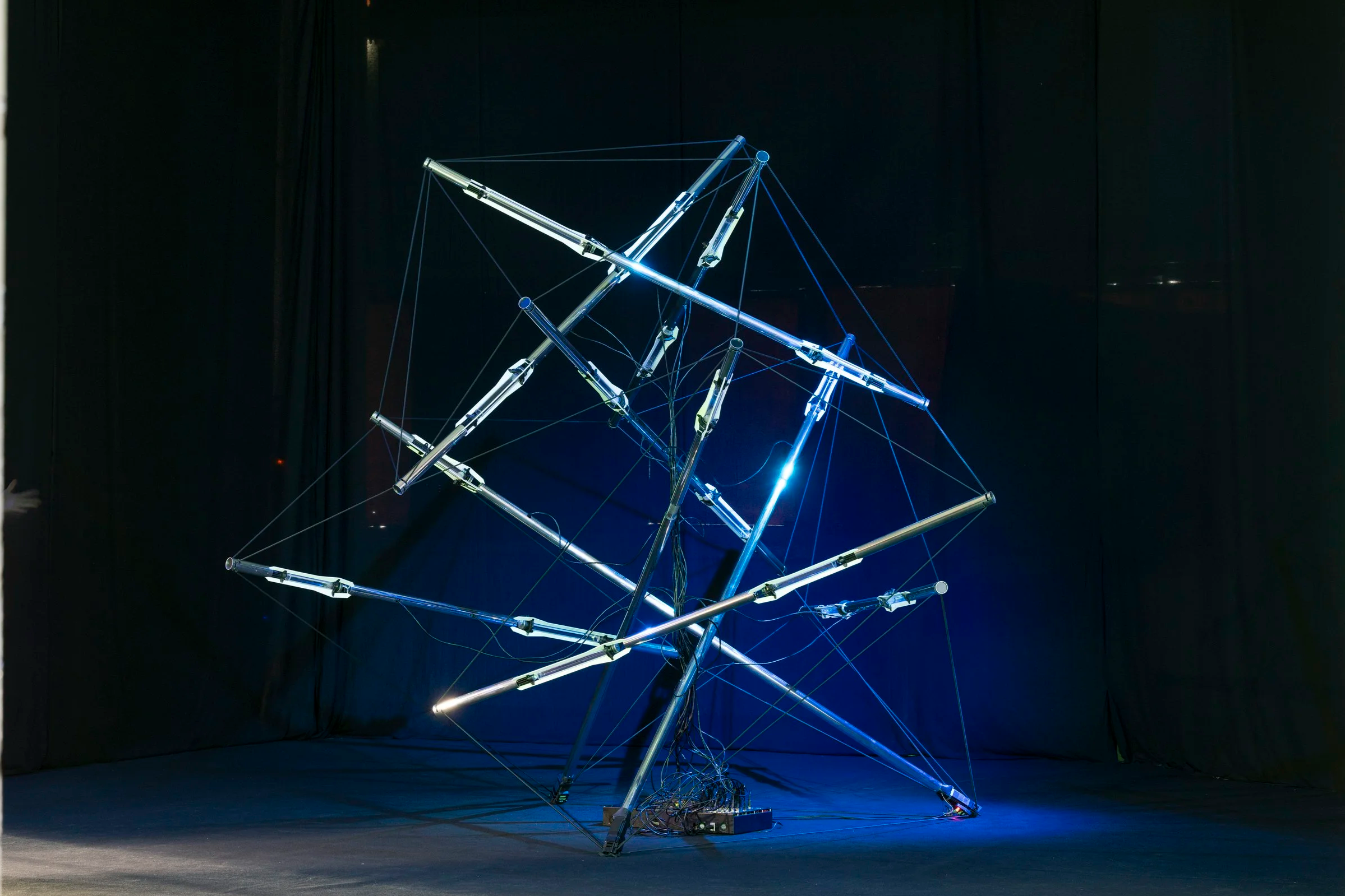 "Don't Look At Me" is a 3x3 meter kinetic sound installation based on the Tensegrity principle. Using custom-built acoustic resonators inspired by the avant-garde designs of Harry Partch, the machine generates physical sine waves. At its core lies a behavioral paradox: sensors track the audience's gaze in real-time. The more attention the entity receives, the more dissonant and frantic its composition becomes, striving for equilibrium only when left unobserved.